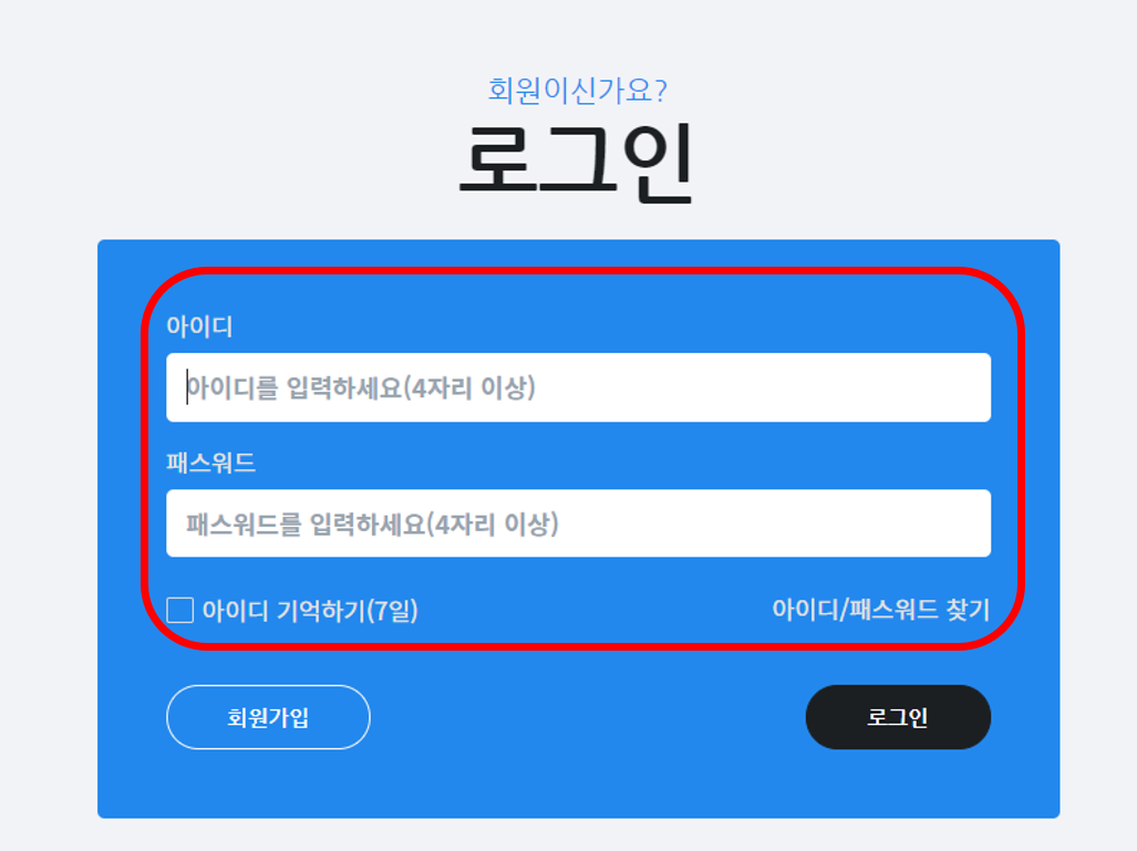 ȸ¿ø°¡ÀÔÀÌ ¸ðµÎ ¿Ï·áµÇ¾ú´Ù¸é ¾ÆÀ̵ð¿Í ÆÐ½º¿öµå¸¦ ÀÔ·ÂÇÏ°í ·Î±×ÀÎ ¹öưÀ» Ŭ¸¯ÇÏ½Ã¸é µË´Ï´Ù. |