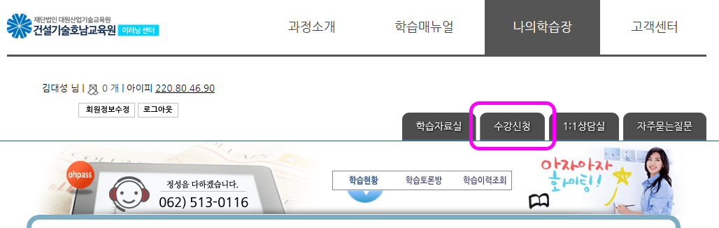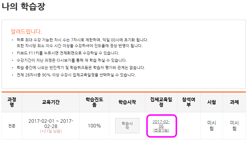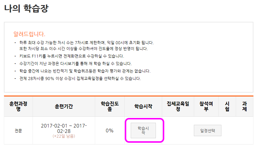³ªÀÇ ÇнÀÀå¿¡¼ ÇнÀ½ÃÀÛ ¹öưÀ» Ŭ¸¯ÇÏ¿© ÇнÀÀ» ½ÃÀÛÇÏ¸é µË´Ï´Ù. 1. ±³À° °úÁ¤¸í°ú ±³À°±â°£, ÇнÀ ÁøµµÀ²À» È®ÀÎÇÏ½Ç ¼ö ÀÖ½À´Ï´Ù. 2. ÇнÀÁøµµÀ² 90% ÀÌ»ó½Ã Áýü±³À°ÀÏÁ¤À» ¼±ÅÃÇÏ½Ç ¼ö ÀÖ½À´Ï´Ù. |