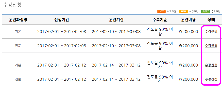 °úÁ¤°ú ±³À°±â°£À» È®ÀÎ ÈÄ ¿øÇÏ´Â ±³À°°úÁ¤¿¡ ¼ö°½ÅûÀ» Ŭ¸¯ÇÕ´Ï´Ù. 1. ½Åû±â°£Àº Á¢¼ö °¡´ÉÇÑ ±â°£À̹ǷΠ½Åû ±â°£ÀÌ Áö³ °úÁ¤Àº Á¢¼öÇÏ½Ç ¼ö ¾ø½À´Ï´Ù. 2. ÈÆ·Ã±â°£Àº ±³À°¼ö° ±â°£ÀÔ´Ï´Ù. |