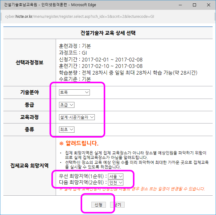 Àڽſ¡°Ô ÇØ´çÇÏ´Â ±â¼úºÐ¾ß, µî±Þ, ±³À°°úÁ¤, Á¾·ù, ÁýüÈñ¸ÁÁö¿ªÀ» ¼±ÅÃÇÏ°í ½Åû¹öưÀ» Ŭ¸¯ÇÕ´Ï´Ù.