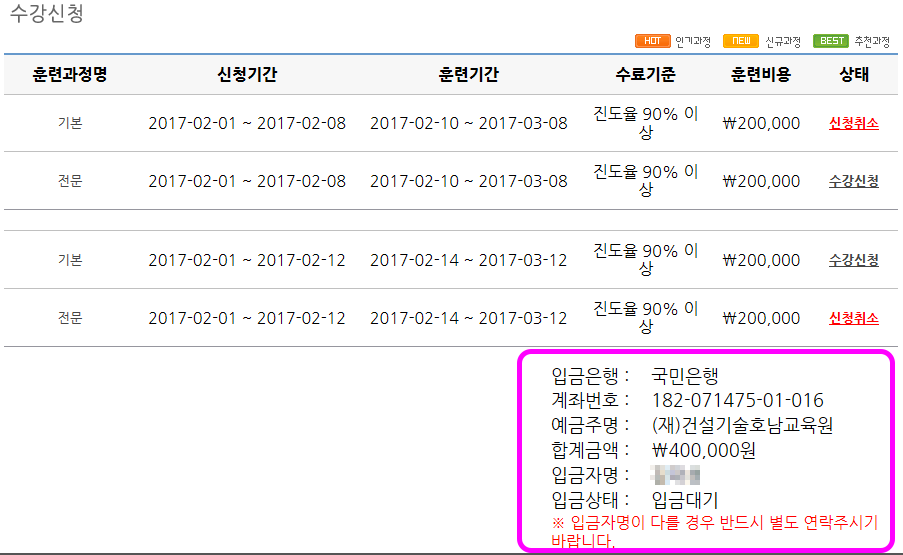 ¼ö°½ÅûÀÌ ¿Ï·áµÇ¸é ÇÏ´Ü¿¡ ÀԱݰèÁÂÁ¤º¸°¡ ³ªÅ¸³ª¸ç 48½Ã°£ À̳»¿¡ ÇØ´ç °èÁ¿¡ ½ÅûÀÚ À̸§°ú ÇØ´ç ±Ý¾×À¸·Î ÀÔ±ÝÇØ Áֽøé ÀÚµ¿À¸·Î ÀÔ±ÝÈ®ÀÎÀÌ ¿Ï·áµË´Ï´Ù.